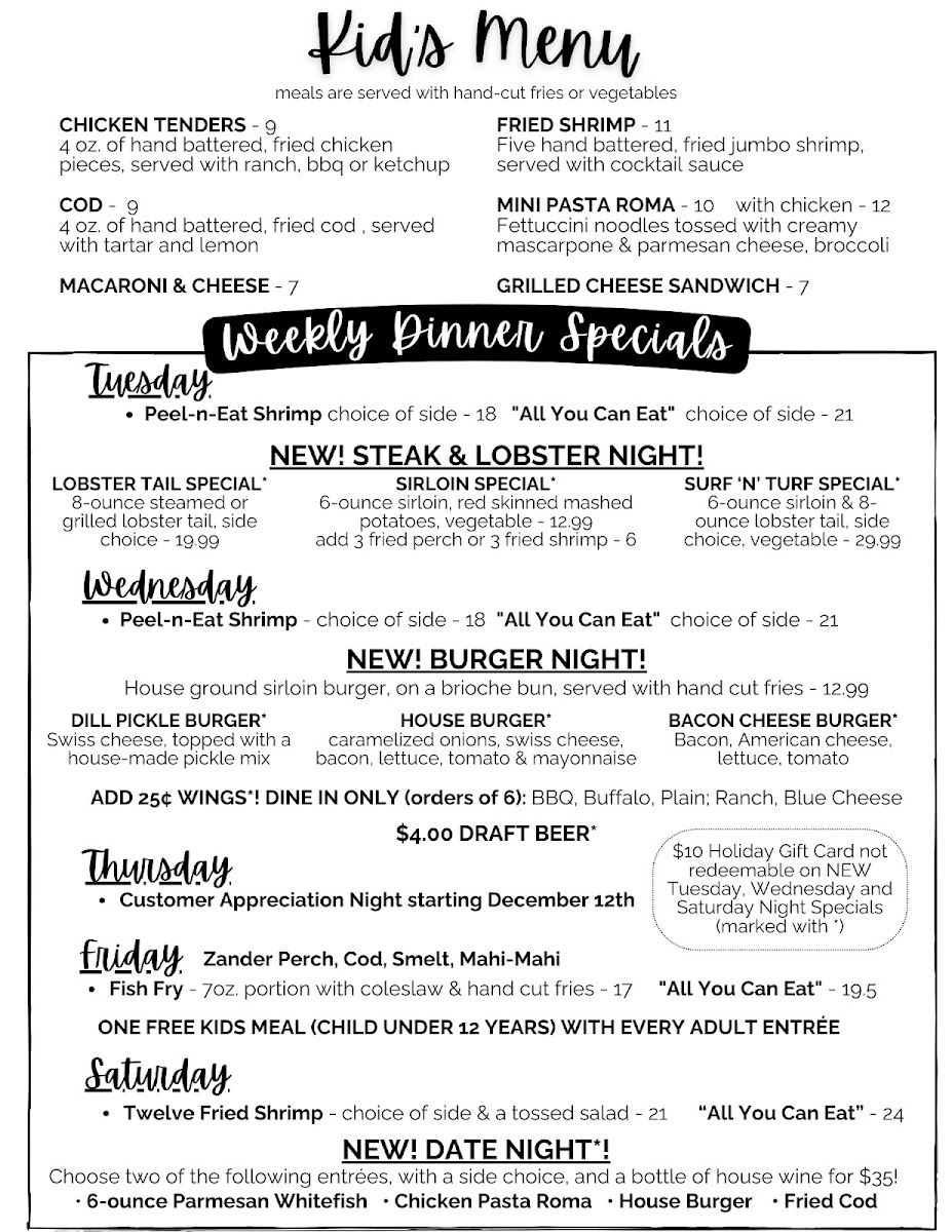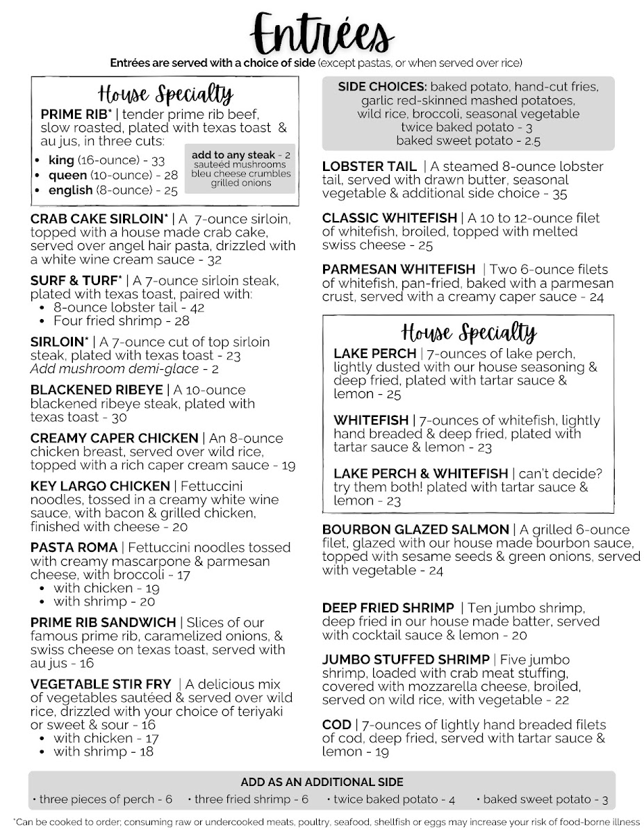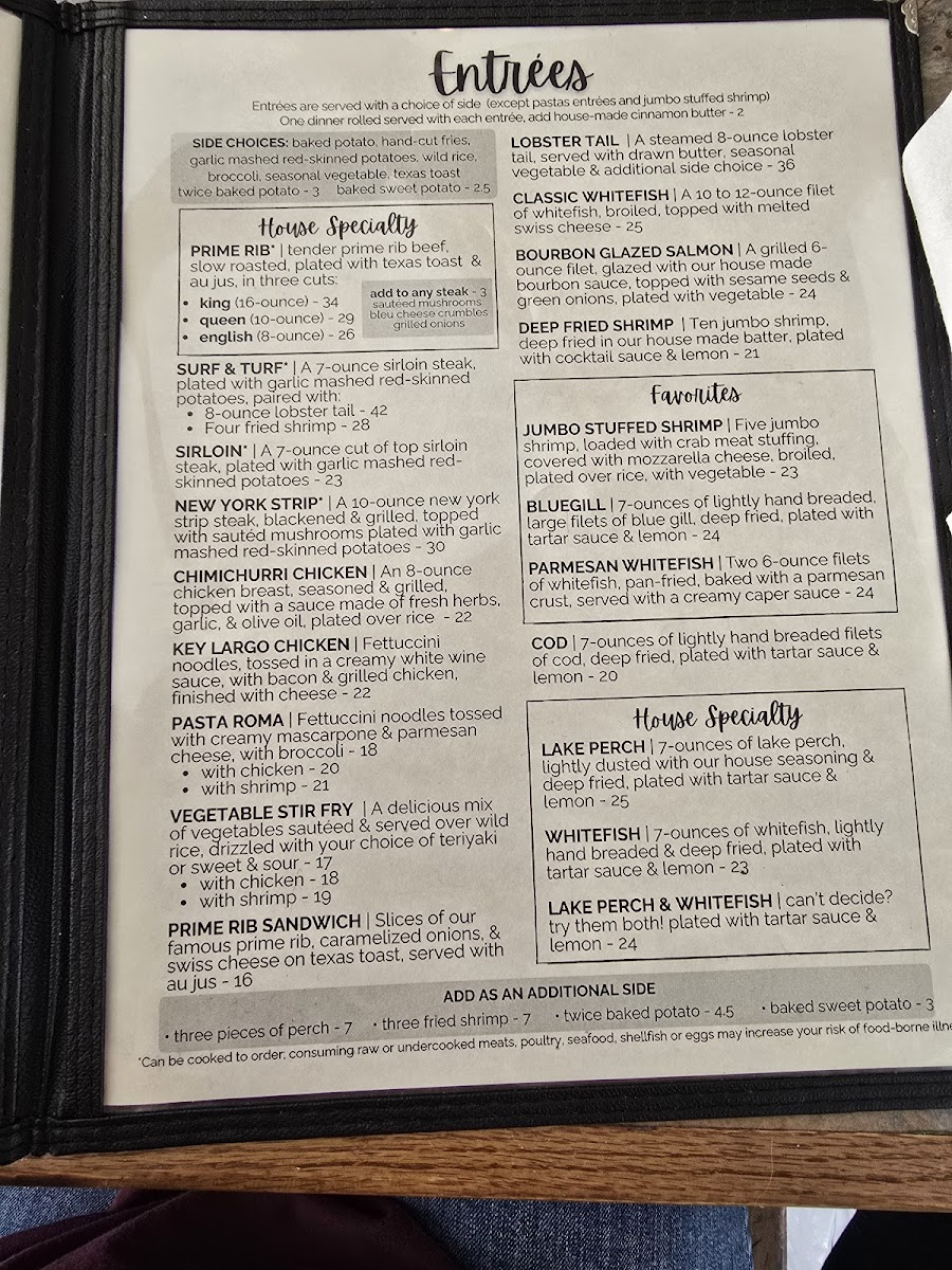Highlighted by rave reviews, the all-you-can-eat fish fry stands out, particularly the cod, praised for its thin, light batter. Guests rave about the fried perch, perfectly pan-fried in butter, providing an ideal balance without the grease. For those craving a more indulgent experience, the lobster tails and prime rib receive high accolades, noted for their stellar presentation and exceptional flavor.